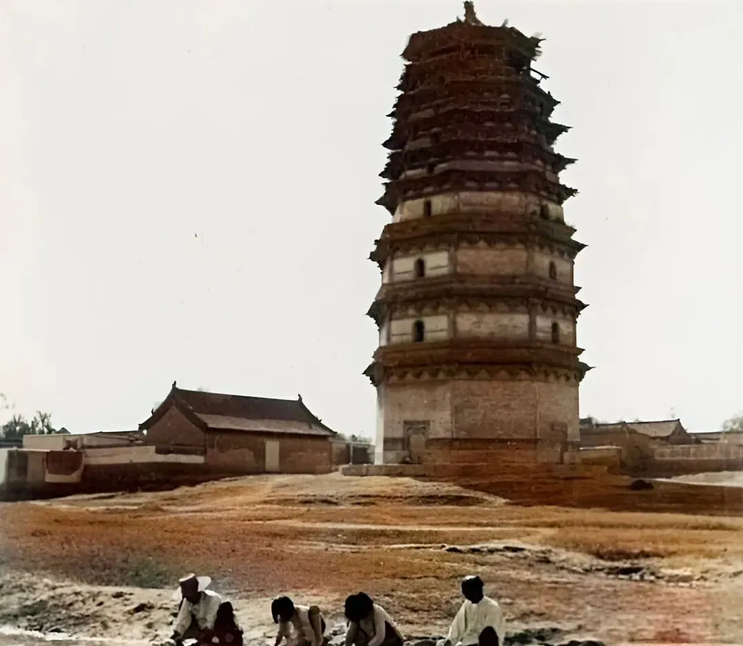 塔体粗壮,青砖叠摞,地上几个男人蹲着干活,谁家地头旁有座古塔都觉着安全,塔见证着天变地变,农人一耕地就成了老景配新事。