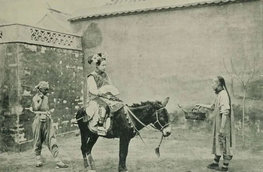图上穿花袍子的满族姑娘,正骑着一头小黑驴准备出门,身后跟着小厮,前头还站着给驴递草料的男孩,衣带宽宽松松,头饰盛得讲究,这一组人站成画,安静里藏着点细腻劲,小时候家里奶奶总念叨,满洲人家出门那姿态,骑驴一晃一晃,和北风、土墙相互映着,早变成胡同口的谈资了。