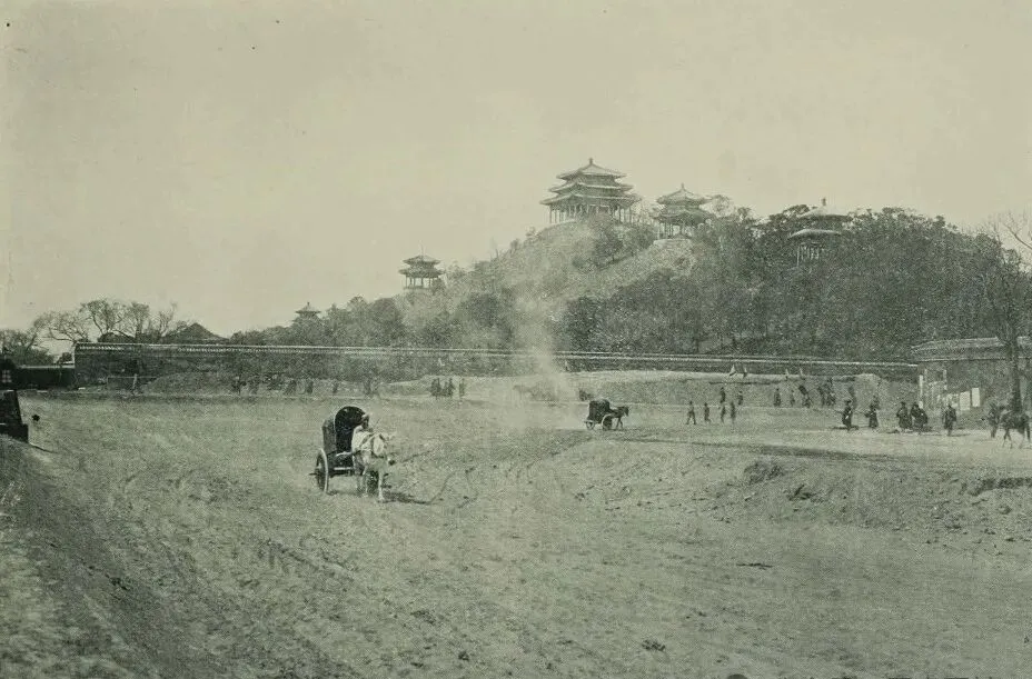 山顶五亭清晰可见,这里的高地叫景山,在故宫正北,老北京人说上了景山儿一眼能望见故宫脊梁,小时候父亲领着我上去,脚下是密密麻麻的灰瓦屋顶,天好能看到西山,照片里没什么游客,只有马车慢悠悠闯过泥道,现在再去景山,都是手机在拍个不停。