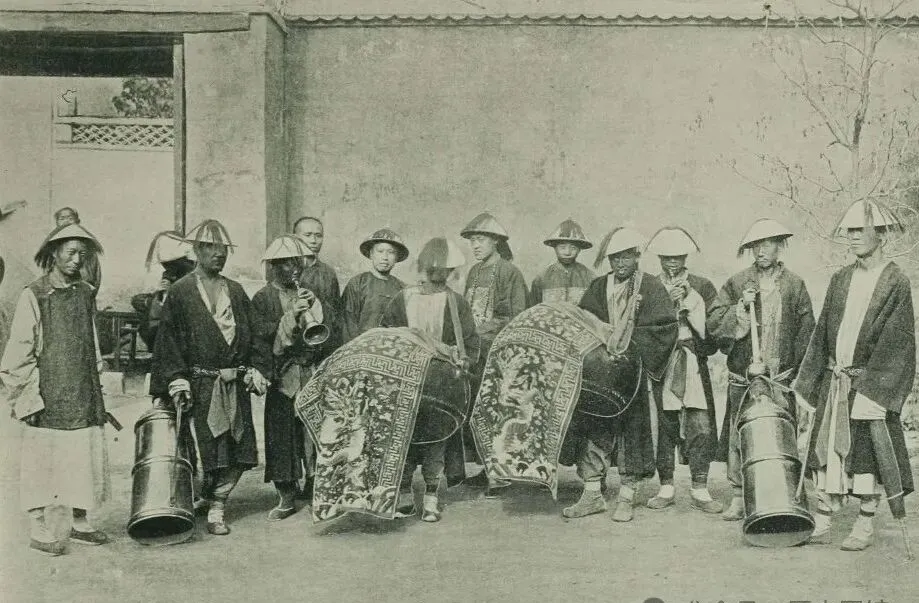 一群穿着长衫马褂的乐师,手里拿着唢呐、锣鼓、铜钹,队伍站齐了正等信号,画面光靠衣着、造型自带一层威风劲,那时候皇家活动一支队伍少不了仗着乐器开道,所有声音一起来,胡同小院子都能抖三抖,反正现在婚礼再热闹,也没那股隆重气氛了。
