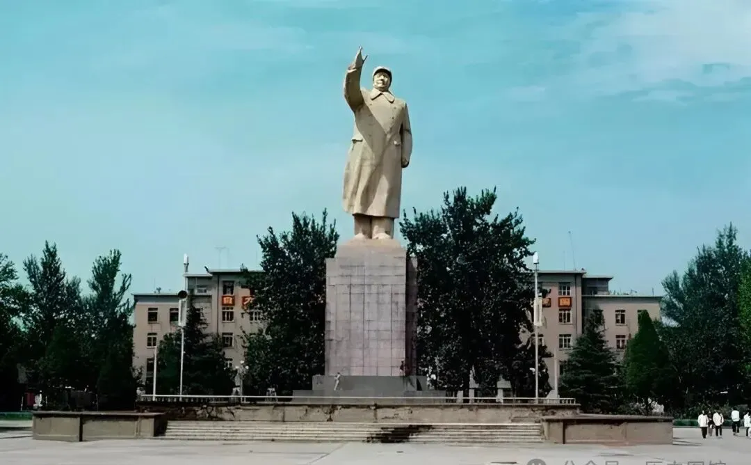 毛主席雕像曾经是全市最硬气的地标,抬头仰望他,风衣一甩,手指前方,好多人出门回家都习惯兜一圈,约对象见面说“咱在毛主席像等”,一准儿听得懂,附近楼房不高,广场特别敞亮,冬天风大,耳边全是旗子的哗哗声。