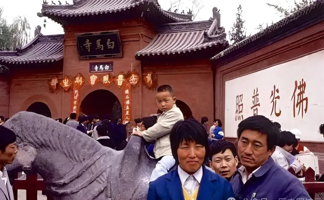 图中就是白马寺山门,大红门楣,灰瓦飞檐,一对石马杵在门口,老两口带着孙子合影,背景里全是来烧香祈福的游客,小时候跟着家人拜佛,手里还拿根小糖葫芦,吵着说“我也要合个影”,现在照片还能翻出来。
