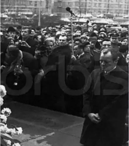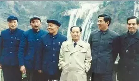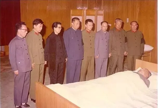 华国峰和四人帮在毛泽东遗体前手拉手的照片,在华另一侧的年轻人是毛远新。