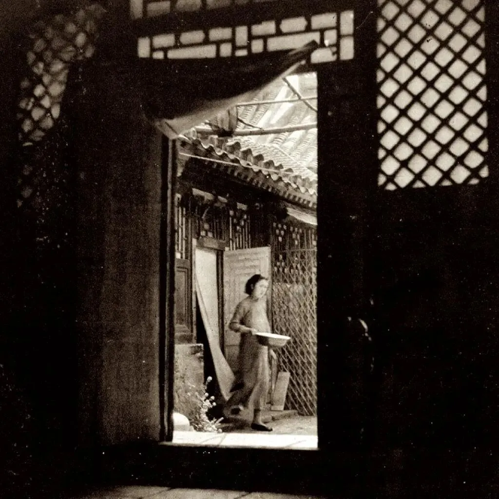 40时代初北平少见历史老照片:图为40时代的北京四合院,一个女人拿着一个方脸来到院子里。