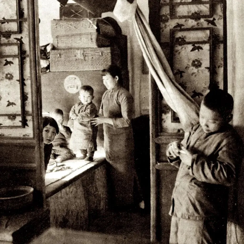 40时代初北平少见历史老照片:图为40时代北平的一户普通家庭,一位母亲和她的4个小朋友,一个小女孩从房间里伸出头,惊讶的看见摄像镜头。