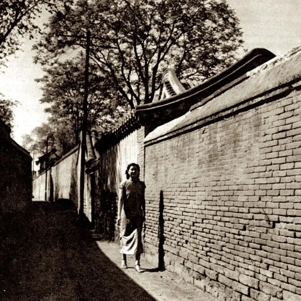 40时代初北平少见历史老照片:图为一个穿着旗袍裙的漂亮女生走在胡同里,北京的胡同全是灰墙黑瓦。
