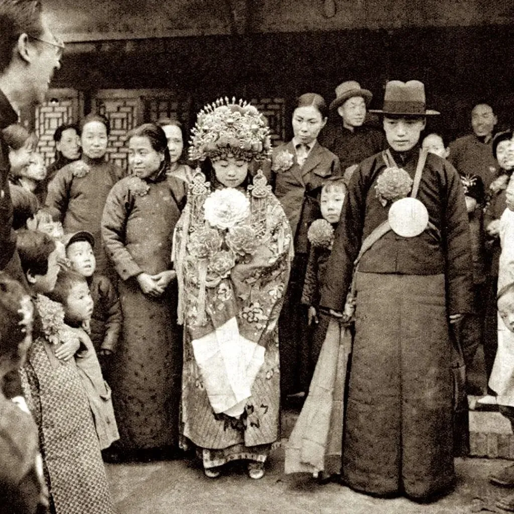 40时代初北平少见历史老照片:图为20世纪四十年代,一个名门望族的少爷娶老婆,新郎新娘穿着传统式的婚服提前准备拜天地。