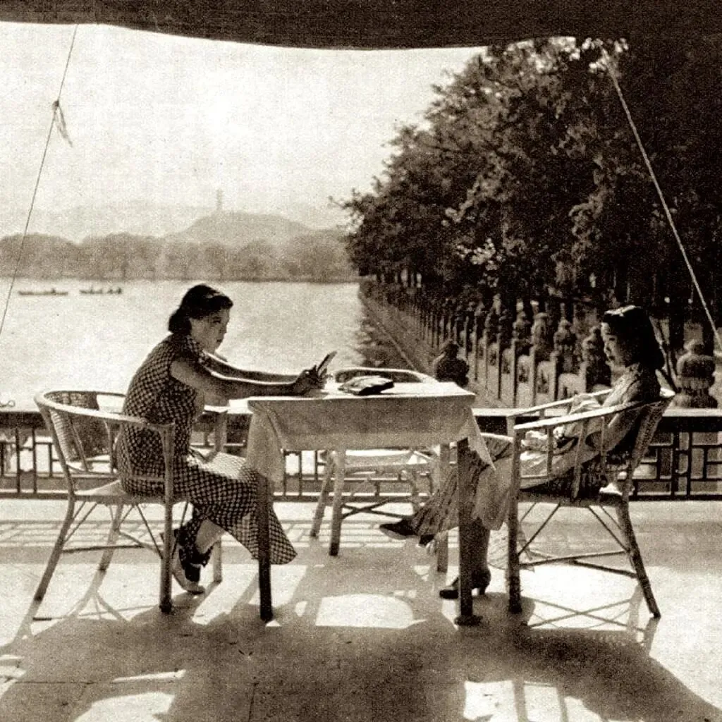 40时代初北平少见历史老照片:图为2个穿着旗袍裙的富家小姐坐到河边欣赏景色、日晒。