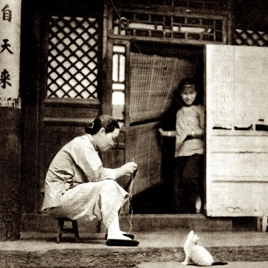 40时代初北平少见历史老照片:图为一对母女,妈妈正坐到院子里做布鞋。