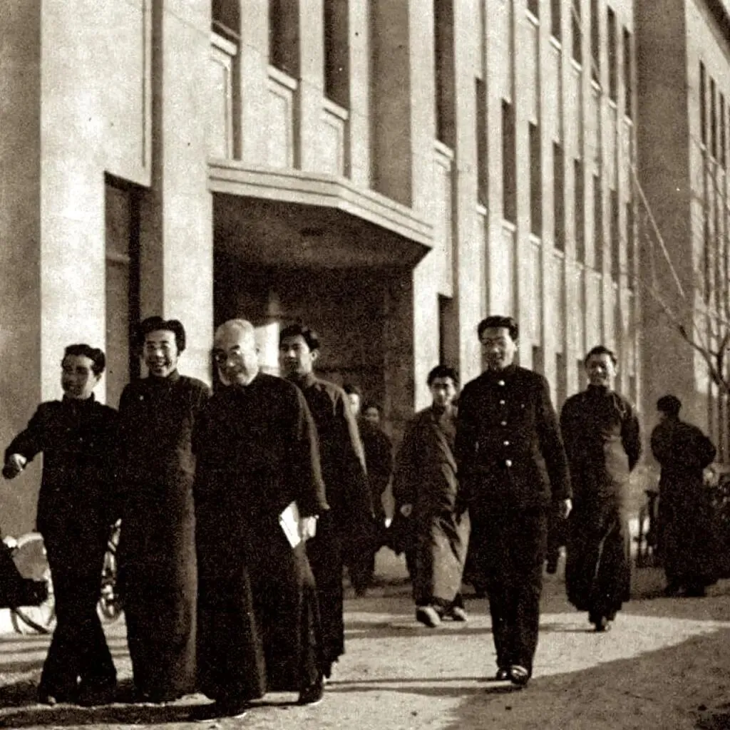40时代初北平少见历史老照片:图为20新世纪40时代的北大,好多个专家教授在办公楼前说说笑笑。