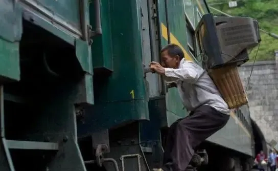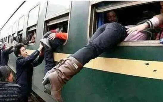 1990年代的绿皮火车,为了更好地可以挤上火车,有一些旅客迫不得已在亲戚的帮助下从车窗玻璃爬进来。
