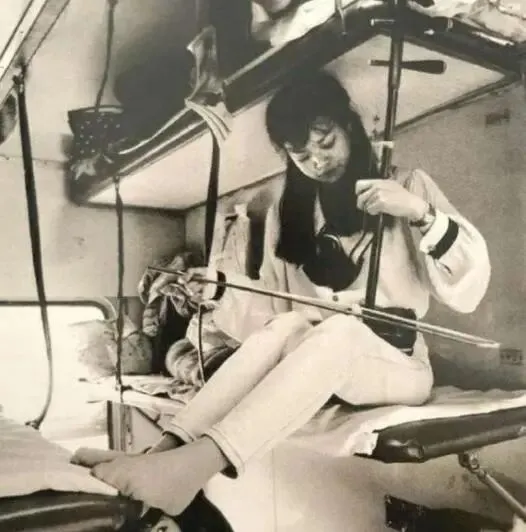 1990年代的绿皮车厢卧铺车厢里,有左右三层卧铺。一个中铺的年轻姑娘拉起了二胡。动听的音乐声吸引了铺上和上铺的旅客。