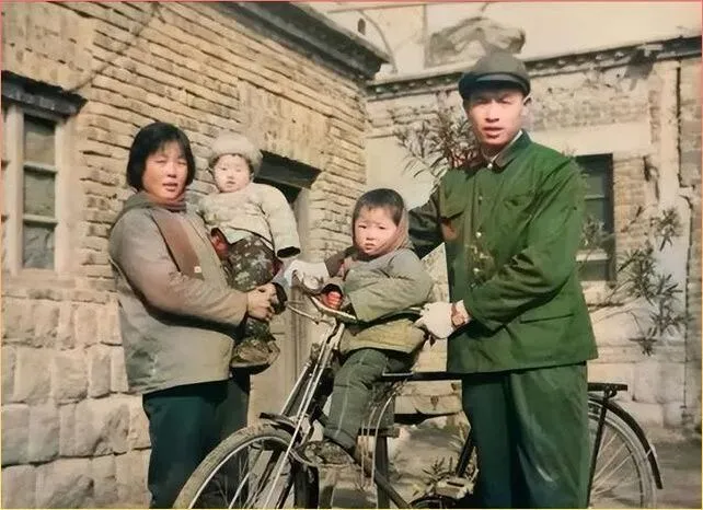 瞧这.一.家.子!父亲.穿着军绿色.的衣服,母亲抱着小娃娃,大孩子坐在自行车上.。这就是.七八十年代最常见.的家庭出行.方式了。那时候没有私家车,一辆自.行.车就能载着全家人.出门,虽然挤了点,但心里却是满满的幸福。看着这张.照片,有没有.想起你小时候坐在爸爸自行车后座.的场景?