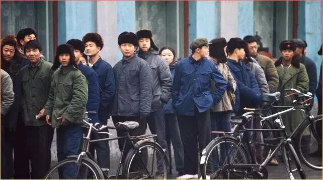 一群人.排.着整齐的队伍,手扶自行车等待着什么.。那个.年代讲究集体主义,无论.是上班,开.会还是办事,都喜欢排队,集合。看他.们穿着.统一的蓝.色,绿色衣服,是不是特别有时代感?