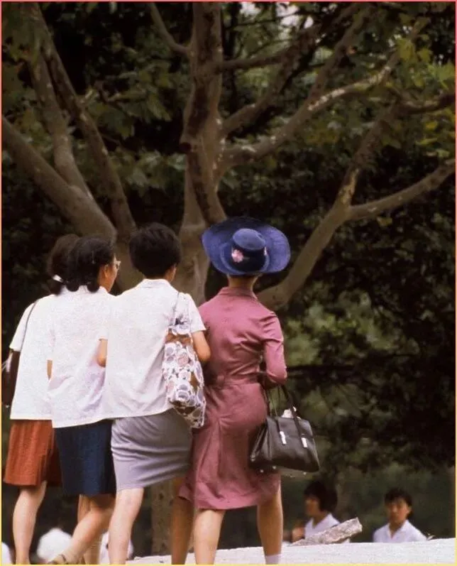 三.位女士站在树下,其.中一位.穿着时髦的粉色套装,戴着大檐帽。这在.当时可.是相当洋气的打.扮了!七八十年.代.,随着改革开放,人们的.穿着打扮也开始变得多样化,不再是清一色的蓝灰绿。