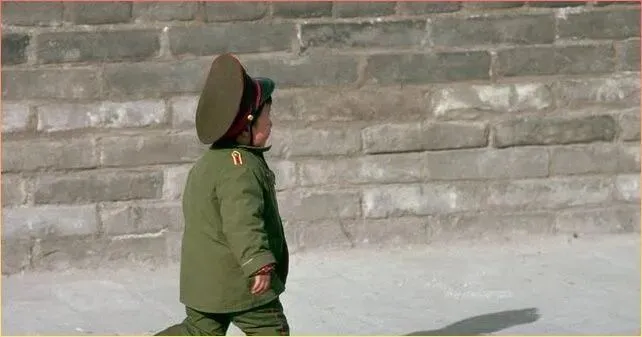 一个穿着军绿色衣.服的小.娃娃.,戴着大军帽,站在空旷的场地上。那时候的孩子们.最喜欢穿军装,戴军.帽,这是他们心中最帅气的装.扮。虽然衣.服大.得不合身,但.小家伙站得笔直,像个小战士。