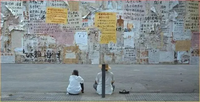 两.个人坐在墙根下,.身.后贴满了各种告示和广告。这种.大字报墙,公告栏.,是那个.时代重要的信息传播渠道。招工信息,.寻.人启事,各种通知,都贴在这样的墙上.。