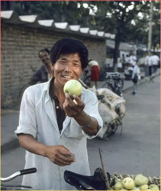 最.后这.张照.片,一位农.民大哥笑容满面.地递过来一个大苹.果。他.的笑容那么淳朴真诚.,这就是七八十年代中.国人最真实的模样。那时候虽然穷,但人与.人之间的感情.却格外真挚.,邻里互助,其乐融融。