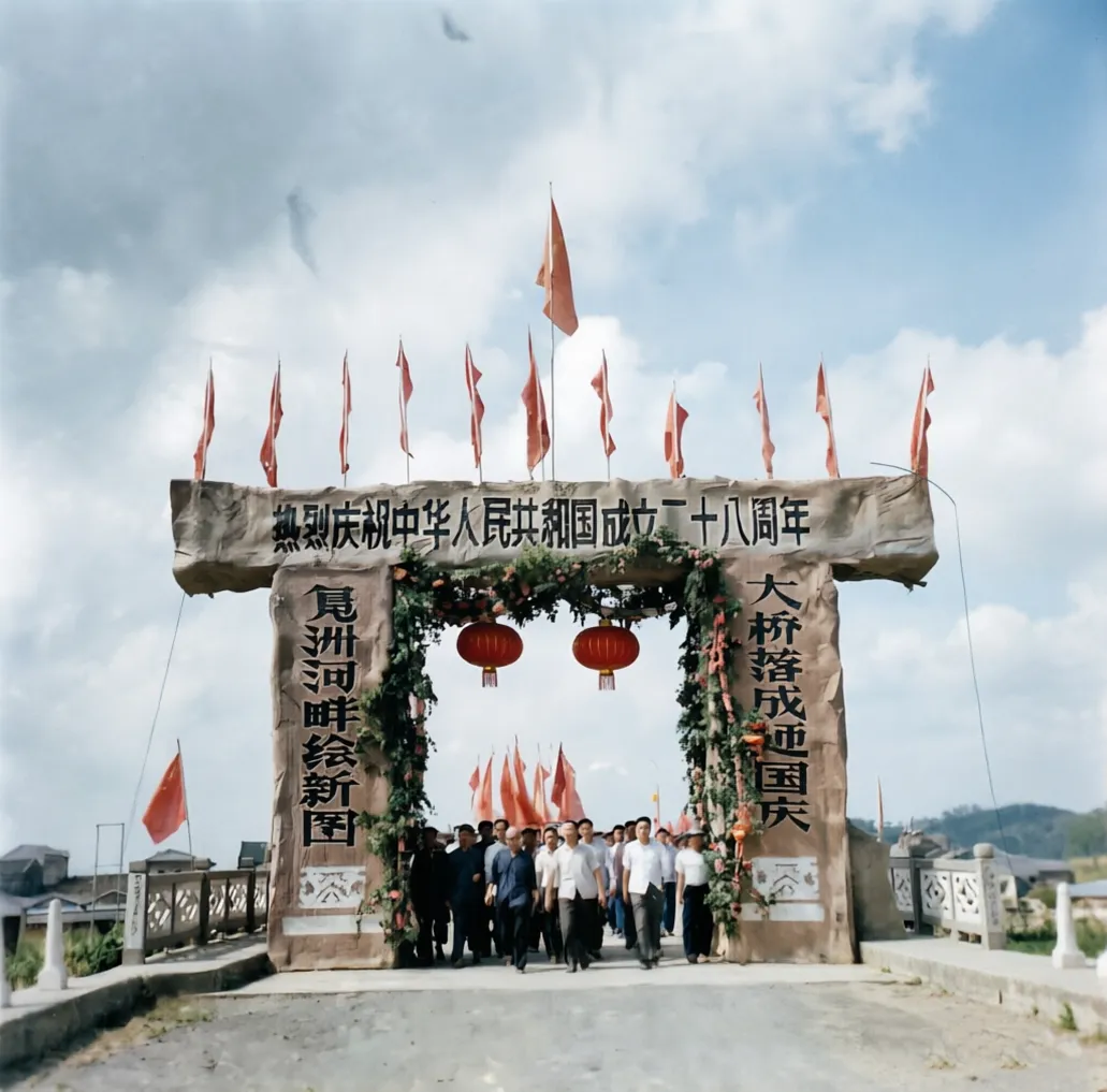 1977年,均安凫洲大桥落成,时值中华人民共和国成立二十八周年,县领导与群众们兴高采烈地参加大桥落成剪彩。
