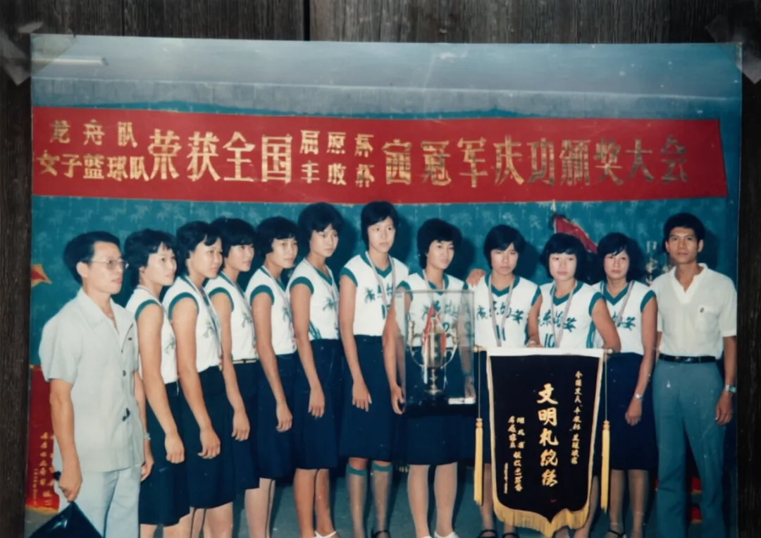 均安女篮成立于1976年11月15日,时任均安公社书记陈荣杰、党办主任彭淞江(后排左)与教练何信夫(后排右)和第一代队员合影(1977年)。