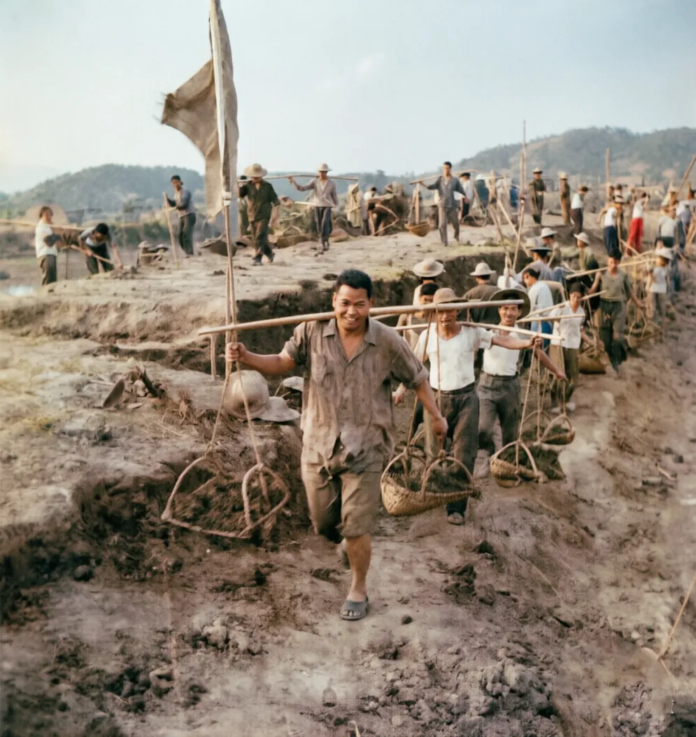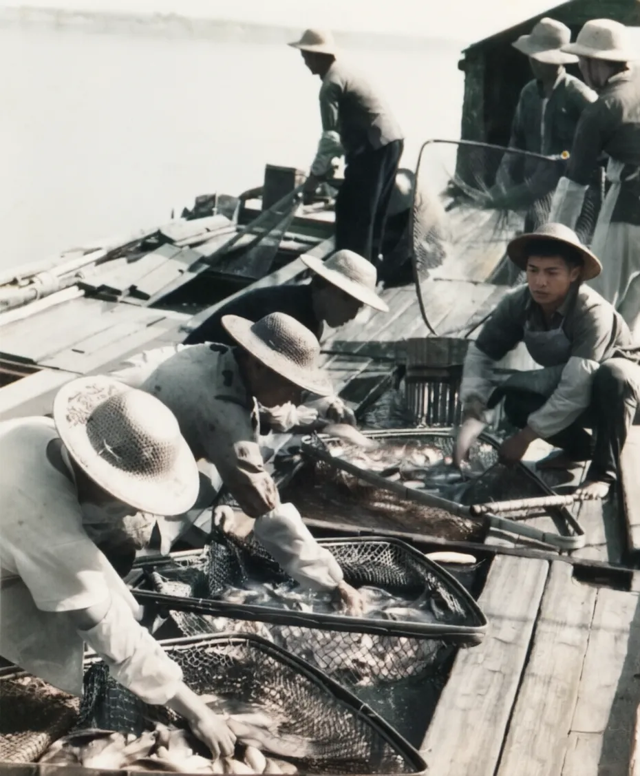 均安公社豸浦大队的社员正把塘鱼交售给国家收购站(1964年,黎尔宽摄影)。