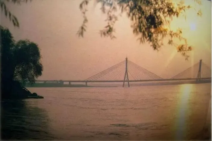 这是跨越黄河的斜拉桥,结合老照片年代与济南黄河桥梁特征,大概率是建邦黄河大桥或更早的胜利黄河大桥,展现了济南“母亲河”黄河的壮阔风貌。