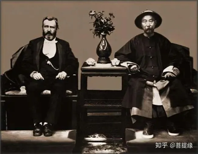 4.1879年拍摄于中国天津,美国第18届总统尤利西斯·格兰特,在结束第二个总统任期后环球旅行的途中来到中国,与李鸿章会面时的合影。