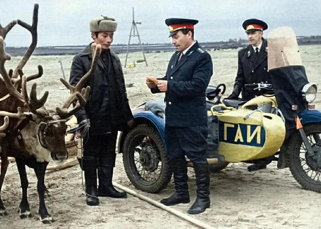 下图:交警检查证件。涅涅茨纳里扬马尔市,20世纪70年代。