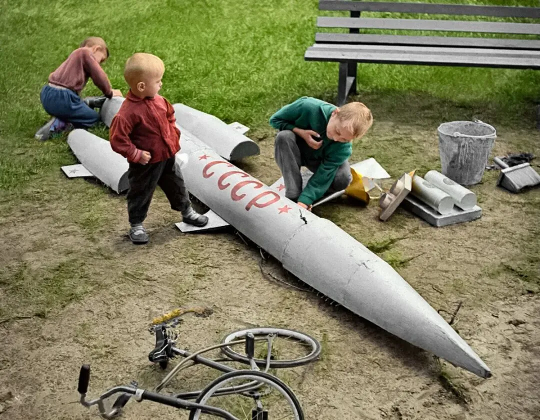 下图:孩子们在自家院子里制作火箭模型。苏俄,1962年拍摄。