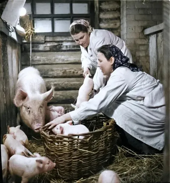 下图:在猪舍里。高尔基州,“先锋”集体农庄,1957-1960年。
