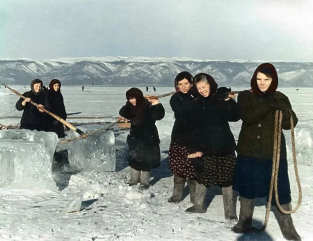 下图:为鱼类加工厂准备冰块。胡日尔,贝加尔湖,20世纪50年代。