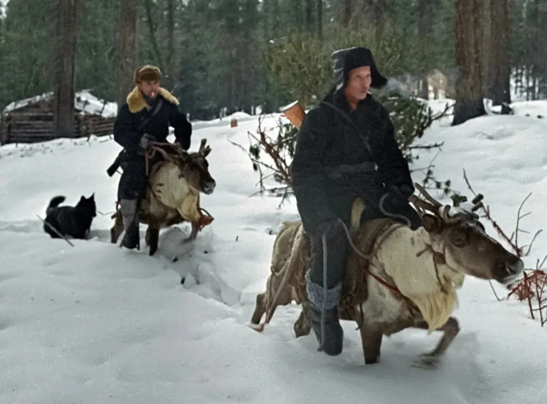 下图:骑着驯鹿的猎人沿着猞猁的踪迹前行。克拉斯诺亚尔斯克边疆区,1965年。