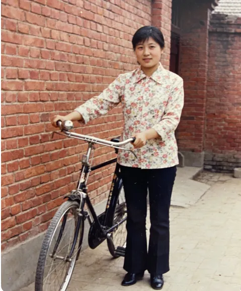1986 年的春天,巷子里的砖缝里刚冒出嫩草,小姨妈扶着那辆小叔叔刚买的 “凤凰” 二八大杠,在自家院门口拍下了这张照片。