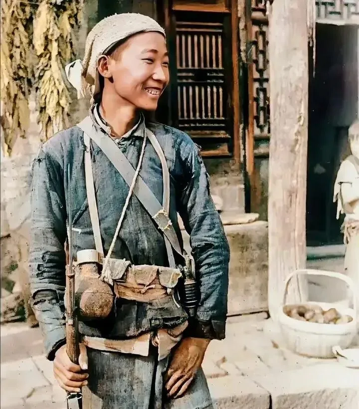 图里这个少年,衣裳旧得发亮,裤子上补丁一块连着一块,腰间拴着大土雷,身上是打过硬仗的印记,笑却是发自肺腑的那种,带着点淘气,怎么看怎么带劲,他一手扶着步枪,那枪上还挂着明晃晃的刺刀,胸前斜着一道子弹袋,手心磨得发亮,看手脚,还带点没褪去的稚气,可那份淡定和自信,跟成年人的稳当劲头有一拼。