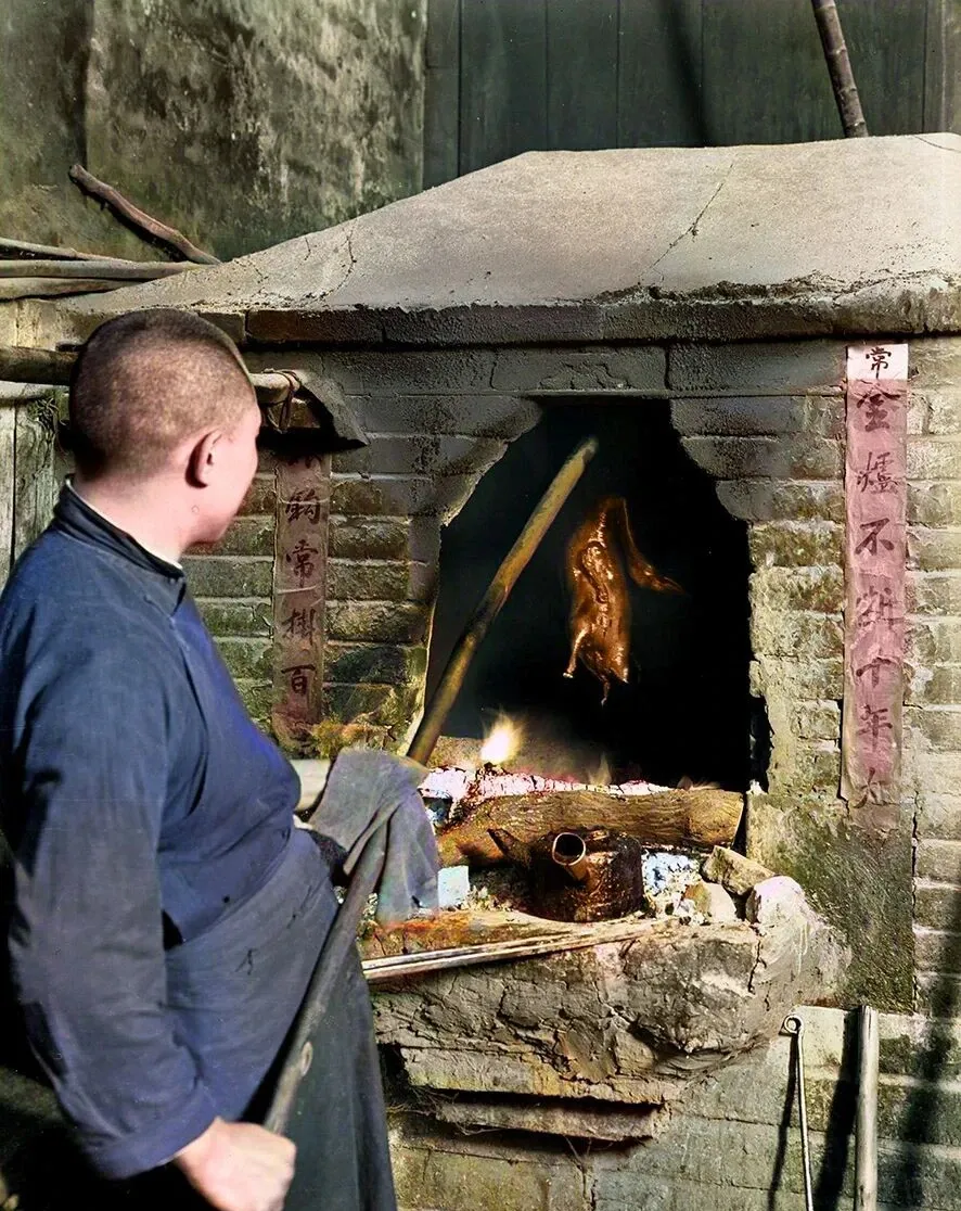 图里这方砖垒的小炉子,就是挂炉烤鸭的好底子,青砖一块一块码得结实,炉口黑乎乎的边上冒着油星子,前头放只带着黑渍的小壶,用来烧水刷皮,有的伙计就用这壶往鸭皮上浇一遍水,再搁回炉里,让皮能鼓起来,烤完油亮亮的,隔着十几米都能看见那层光。
