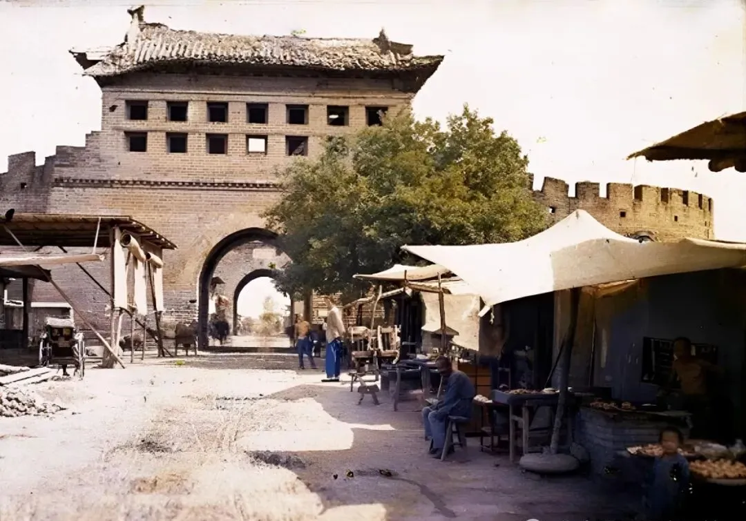 图里的城门真结实,青砖砌墙,檐角窝着老麻雀,门洞下,小摊挑子、马车、闲人一锅烩,商贩坐着玩算盘,小孩子跟着大人跑来跑去,这边树下是张旧桌,拐角铺子里冒着烟气儿,闹哄哄一条街,全是那年月的响动。