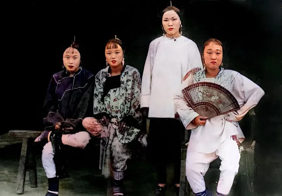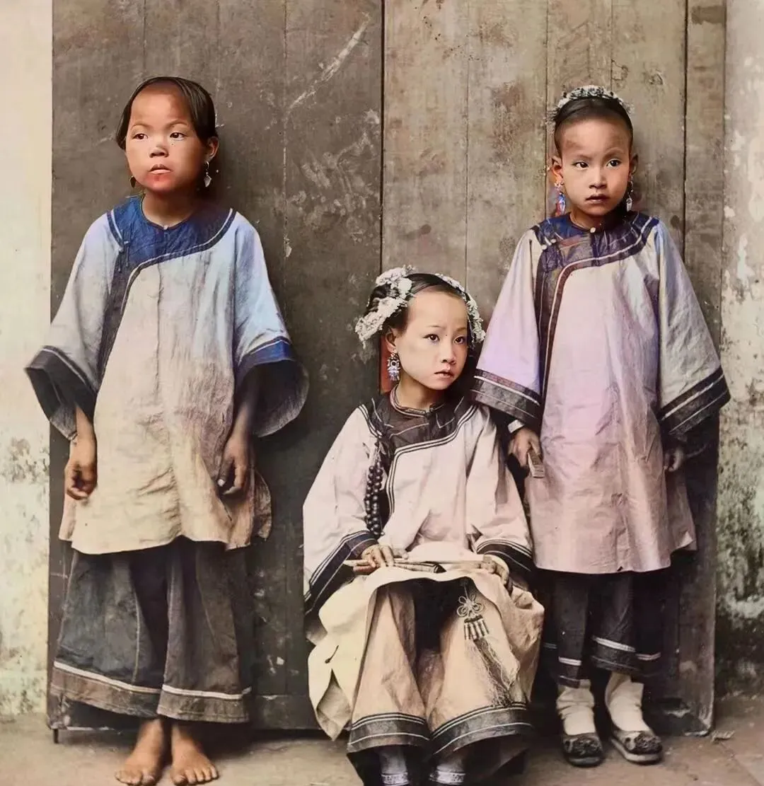 这个合影,是清朝末年闺阁里的四个姑娘,发髻梳得齐整,姑娘手里扇子张得大气,衣裳上细碎的花,白袜黑鞋,穿起来利利索索,有人说清末的姑娘都是规规矩矩的,其实个顶个有主意,小时候家里也有一张全家福,怎么看怎么噙着点倔劲儿。
