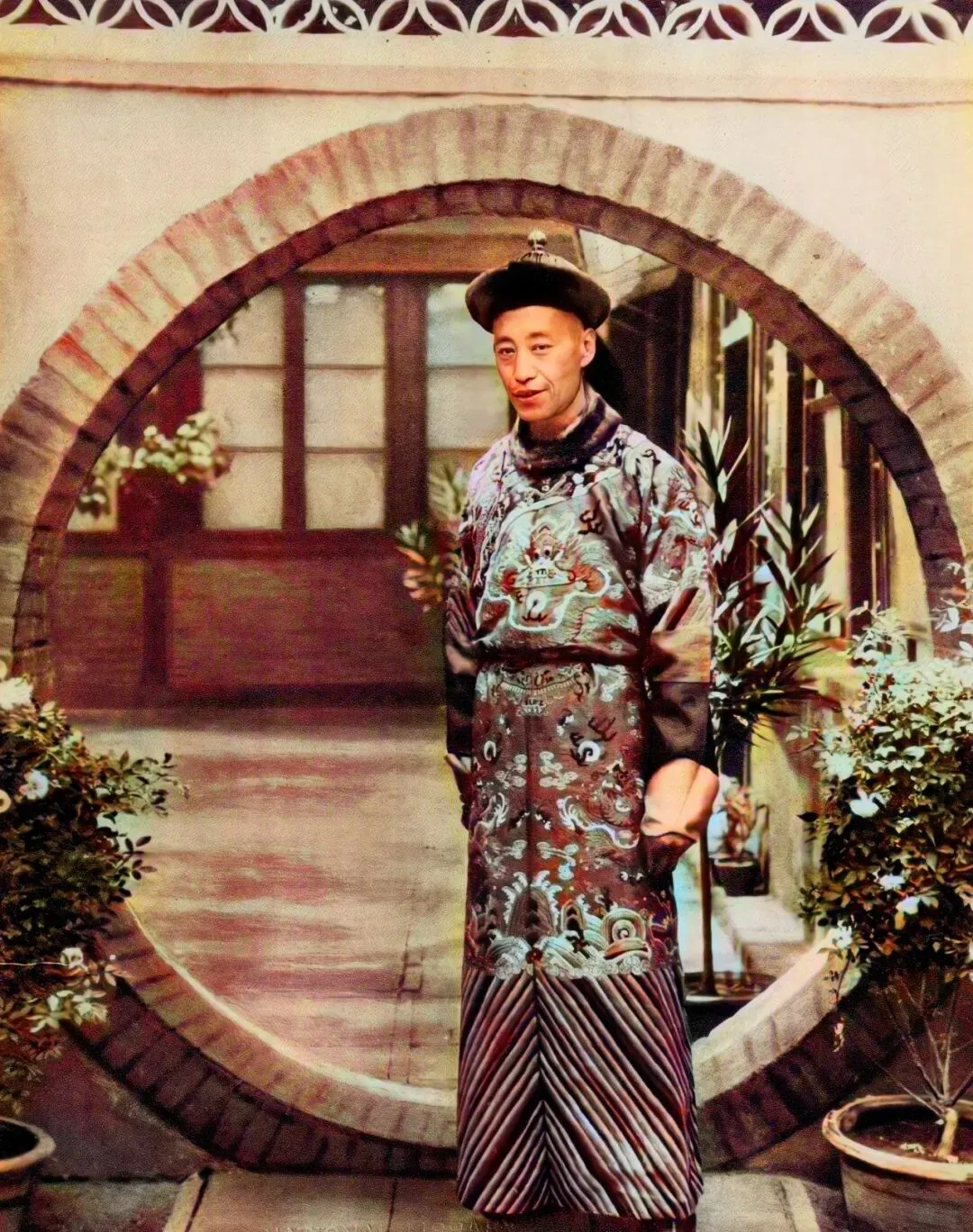 这位穿蟒袍的爷们儿,大清的本色,一站在圆门跟前,气势立马撑起来,衣服上绣着海水江崖云龙,连帽子都讲究,一身行头,天冷了得披狐皮,天热凑合点也打挺着,听老人说,这等人家里常有香案、盆景,连院砖都比外面干净。