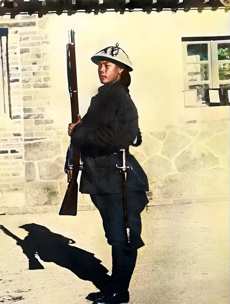 这个清军士兵,顶着个圆帽,手里紧搂钢枪,衣裳肩处宽大,裤脚一鼓,站姿挺括,阴影落地,真像一块碑,爷爷咧嘴乐,说“这身装束看着精神,真打起来还不如地头的混混”,新旧相交的年代,老兵也不认输。