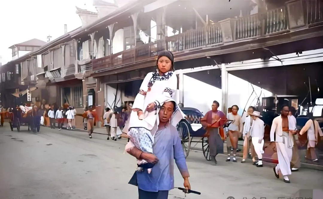 图中这男子扛着个穿花衣裳的小姑娘,满街走,一手抓杖一手扶腿,这行当叫“龟奴”,混口饭吃,不在乎旁人怎么瞧,整条街都是各忙各的,人情冷暖比风大,后来城里再也见不着。