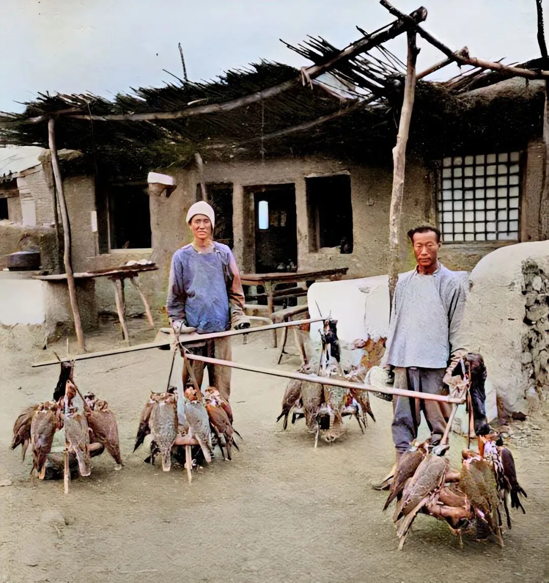 扛着竹竿上吊着野鸡野鸭,后头还拖着个野兽,皮毛发亮,这场景也就是过去集市能见,卖货的老汉肩膀压得一高一低,脚底沾着泥,买主掂掂分量,哪如现在超市里净净爽爽。