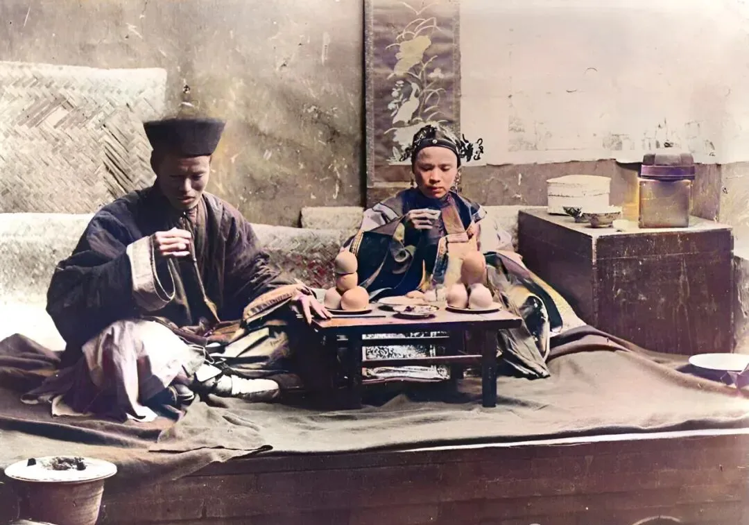 小两口席地而坐,面前一小桌,碗里盛满喜气水果,穿着大袖马褂,两人对着杯,眼睛还透着些新鲜劲儿,清末婚礼,少不了这样热乎劲儿,讲规矩更讲气氛。