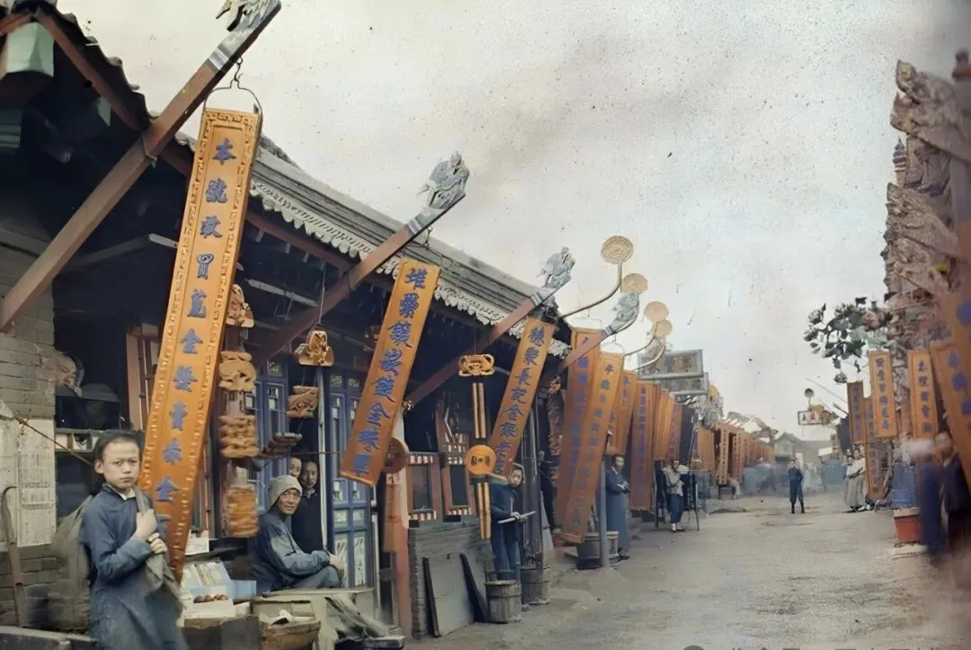 清末的街道老有味道,两旁高高地插着牌匾,金字蓝底,老远就招手,楼上有木雕,檐下挂风铃,生意人的算盘噼里啪啦响个没完,边上还有等着刚开张的伙计,小时候奶奶说,街上人多,“一走就是半天,回来腰带都勒松了”,如今再大的商场,也再找不到那股烟火气。