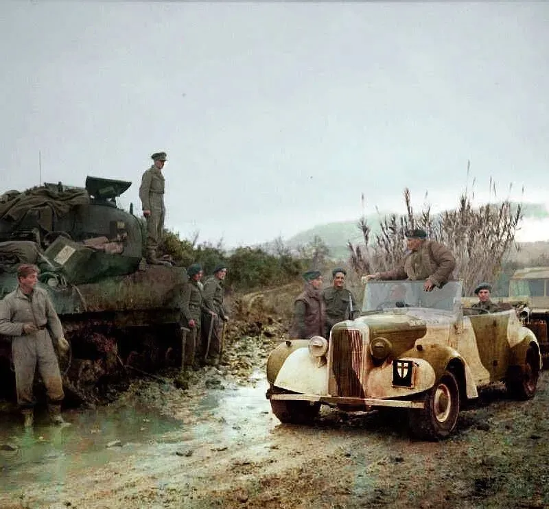 图中前头这辆黄白相间的敞篷老车就是Humber Super Snipe,英军高官才配得上的家伙,车身宽大,头灯明亮,英国味儿十足,蒙哥马利将军一个人坐在驾驶座上,穿着旧军服,脸上没什么表情,车停在泥泞的战场边,跟玩泥巴一样,四周站着一圈英军,裤腿全是泥,没人想着抱怨,倒像是谁闯了祸被老大撞见了。