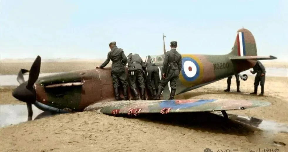 沙地上趴着的这架飞机,大圆标志的英军喷火MK1,机身已经歪斜,螺旋桨打弯,七八个德国士兵围着它扒拉着看,屁股都快蹭塌了,一张老照片把那时候的风吹沙砾和慌张全给凝住了。