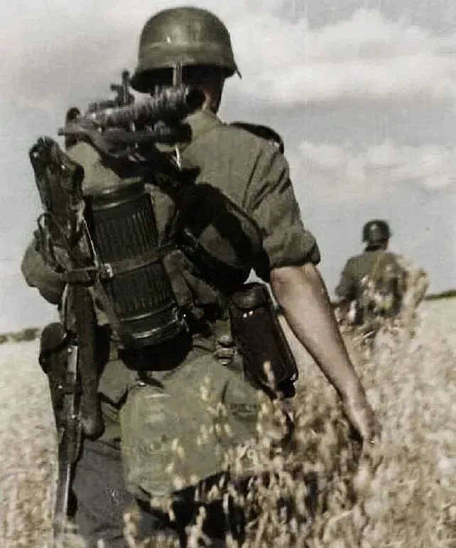 照片里背着圆筒铁罐子的德国兵,背影直挺,罐子黑黝黝的、把带子斜挂着,很容易让人误会是啥打饭桶,走路能撞得当当响,其实这是德军配发的防毒面具桶,打仗从不离手,老兵说那东西谁掉谁挨罚。