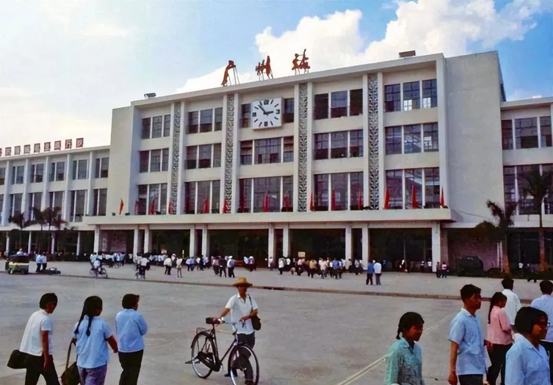 图中这幢白色大楼就是广州火车站,正面墙上的大钟特别有气势,屋顶站着几尊雕塑人像,小时候家里人要走远路,总离不开这个地方,门口经常是拖着布包的男女老少,推着自行车的、扛行李的、挑担子的都有,夏天一到,晒得柏油地面晃眼,哪个人都是满身汗湿,爸说当年的广州梦,就是从这块出发的。