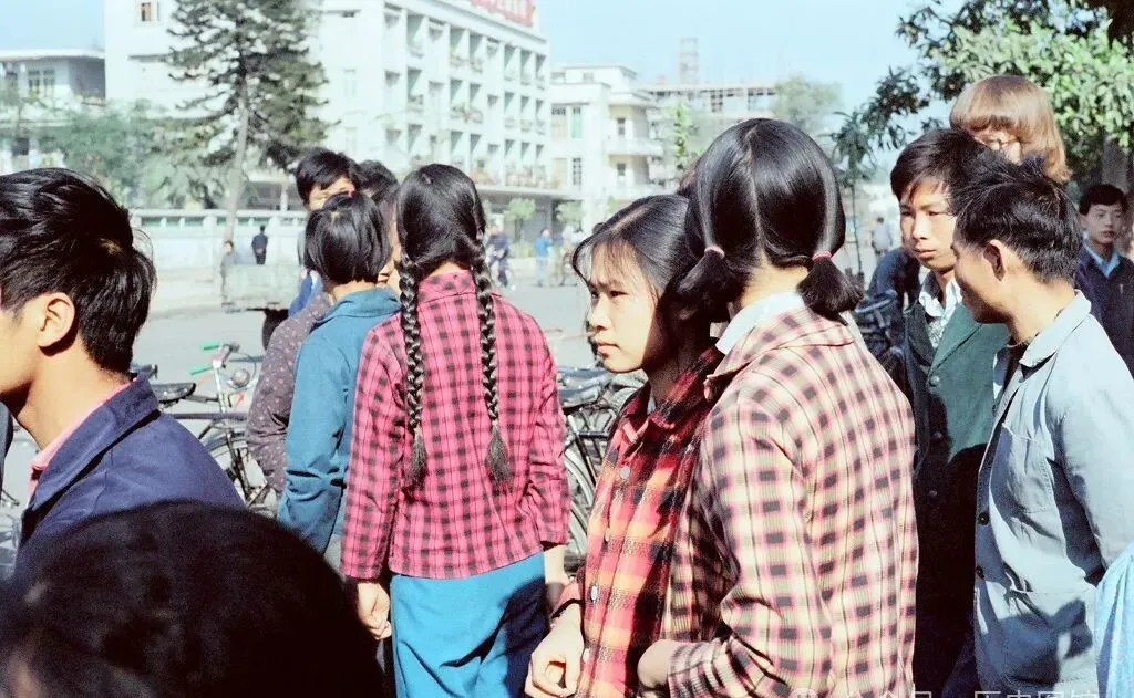 照片里这几个女青年,一个长辫子晃到腰上,边上还有个金发外国人混在普通人群里,那会儿外国人还挺稀罕,街头人不多但衣着整齐,穿着格子衫、蓝布裤的姑娘小伙个个精神,背着书包,骑着单车,老爸说“见她们一个,就是见着广州青春的样子” 。