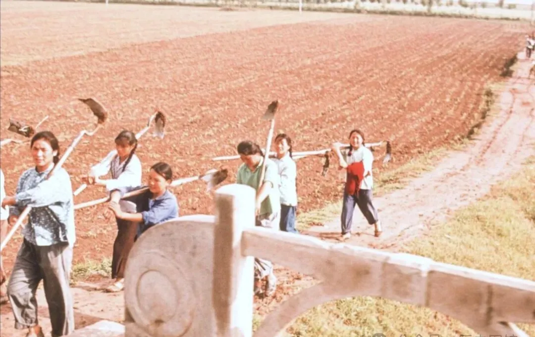 这队女社员扛着锄头排成一溜往田里走,遥远地能看到刚发芽的庄稼和整理好的地垄,一身蓝衣、黑裤,一边走一边说笑,妈妈总提以前下地劳动一群姐妹人手一把锄头,扛着瓜果蔬菜上集市,太阳底下越干越黑,谁怕啥热啊。