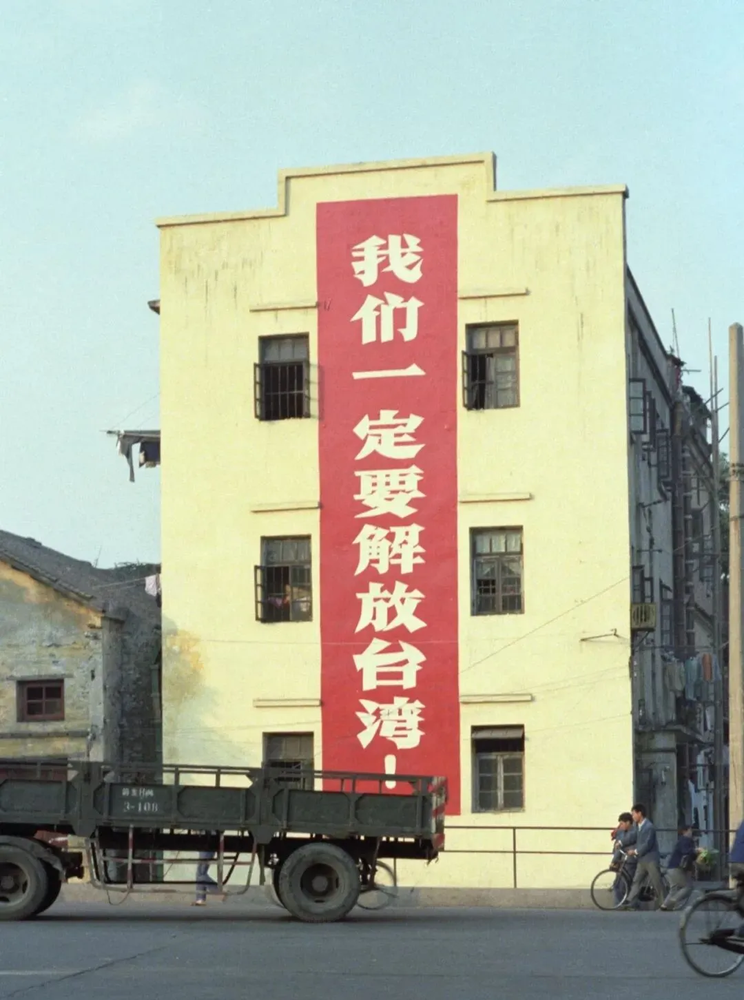 拍下的这栋房子,墙上一条大红标语“我们一定要解放台湾”,阳光下红白相间很醒目,这一类标语哪个街区都有,成了城市的醒目标记,也是当年集体记忆里的背景墙。